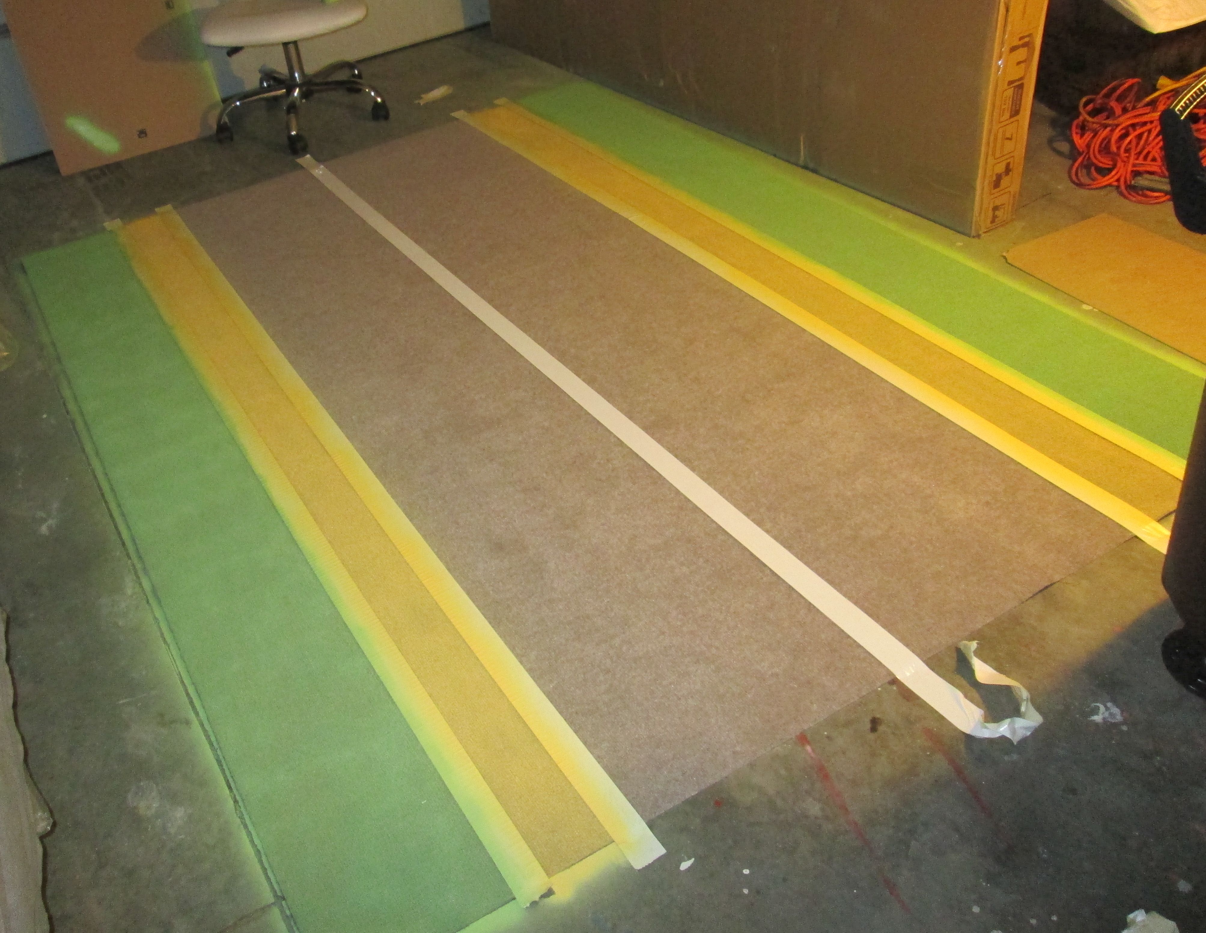 I started just taping off stripes. I used duct tape so it would stick to the carpet. I was only concerned that the first stripe on each long end was the same on both sides so I used a cardboard piece that was about the width I wanted my first stripe to be. I did that all along each end and put pieces of tape to keep myself straight.