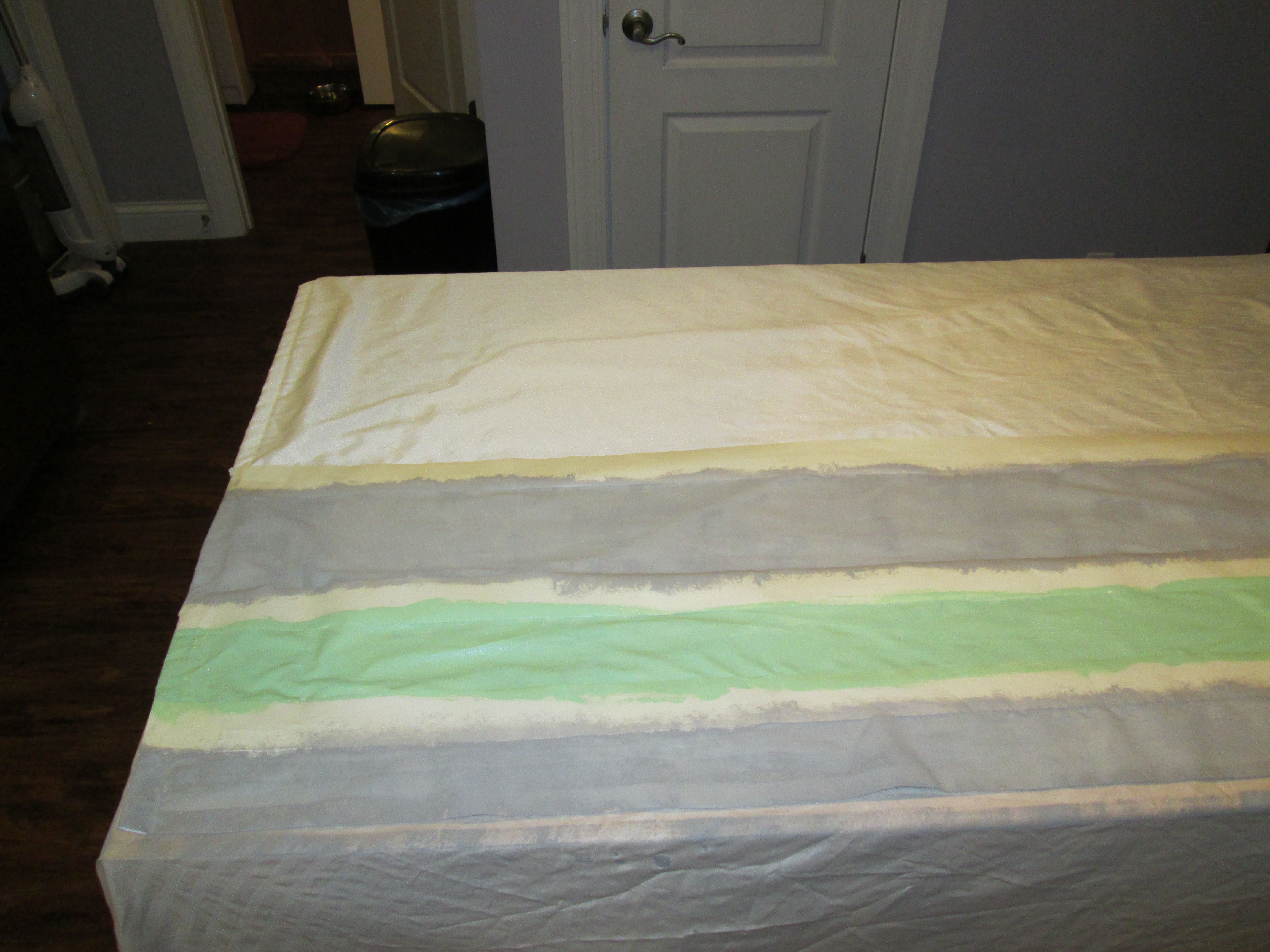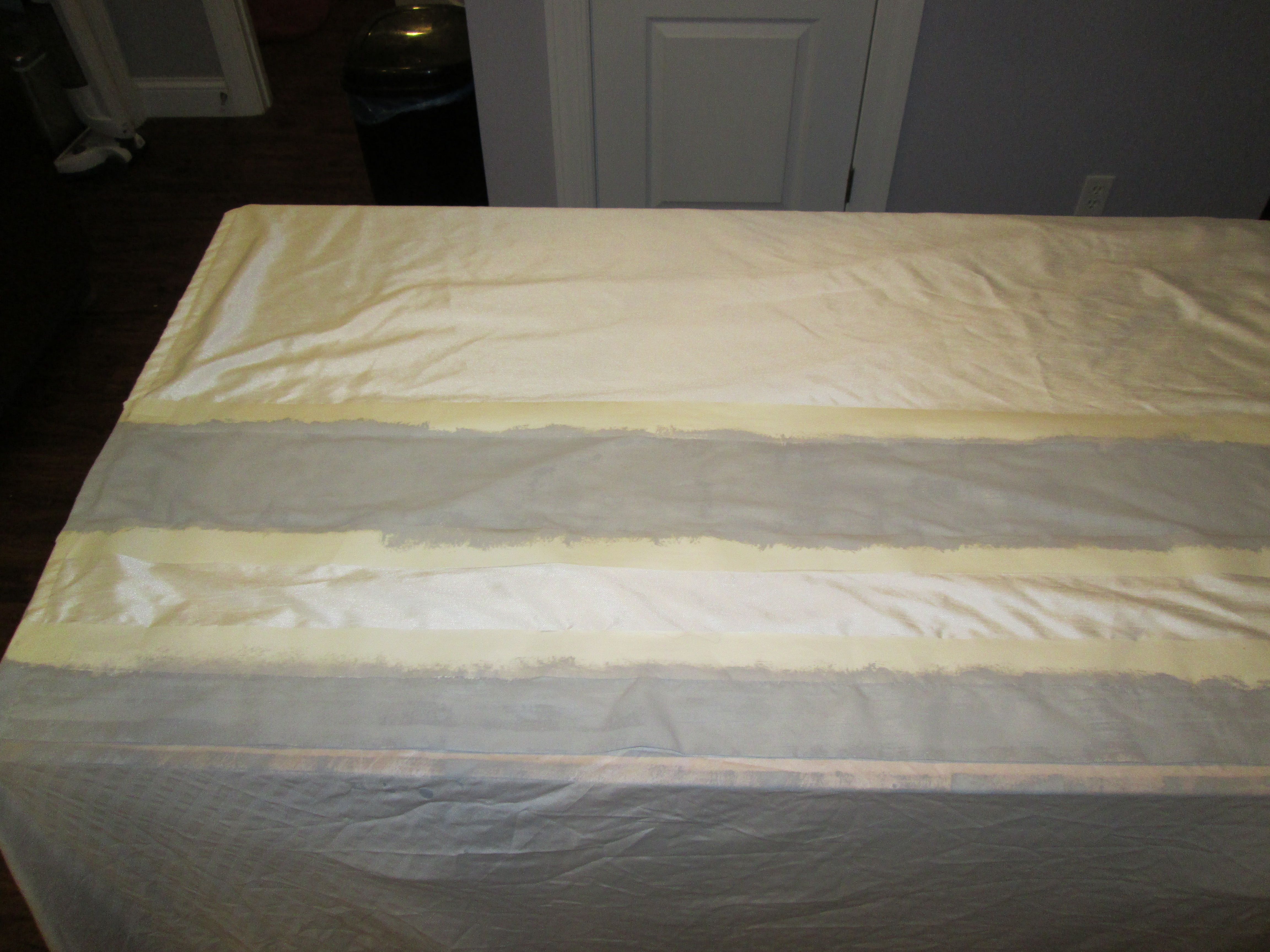 I brought them home and lined them out. The biggest worry, of course, was making certain that the stripes would be even on each panel. I ended up not using a tape measure for fear that even a centimeter would easily show, so I used a box! Actually, a box of blank checks. The next I used the width of the tape.