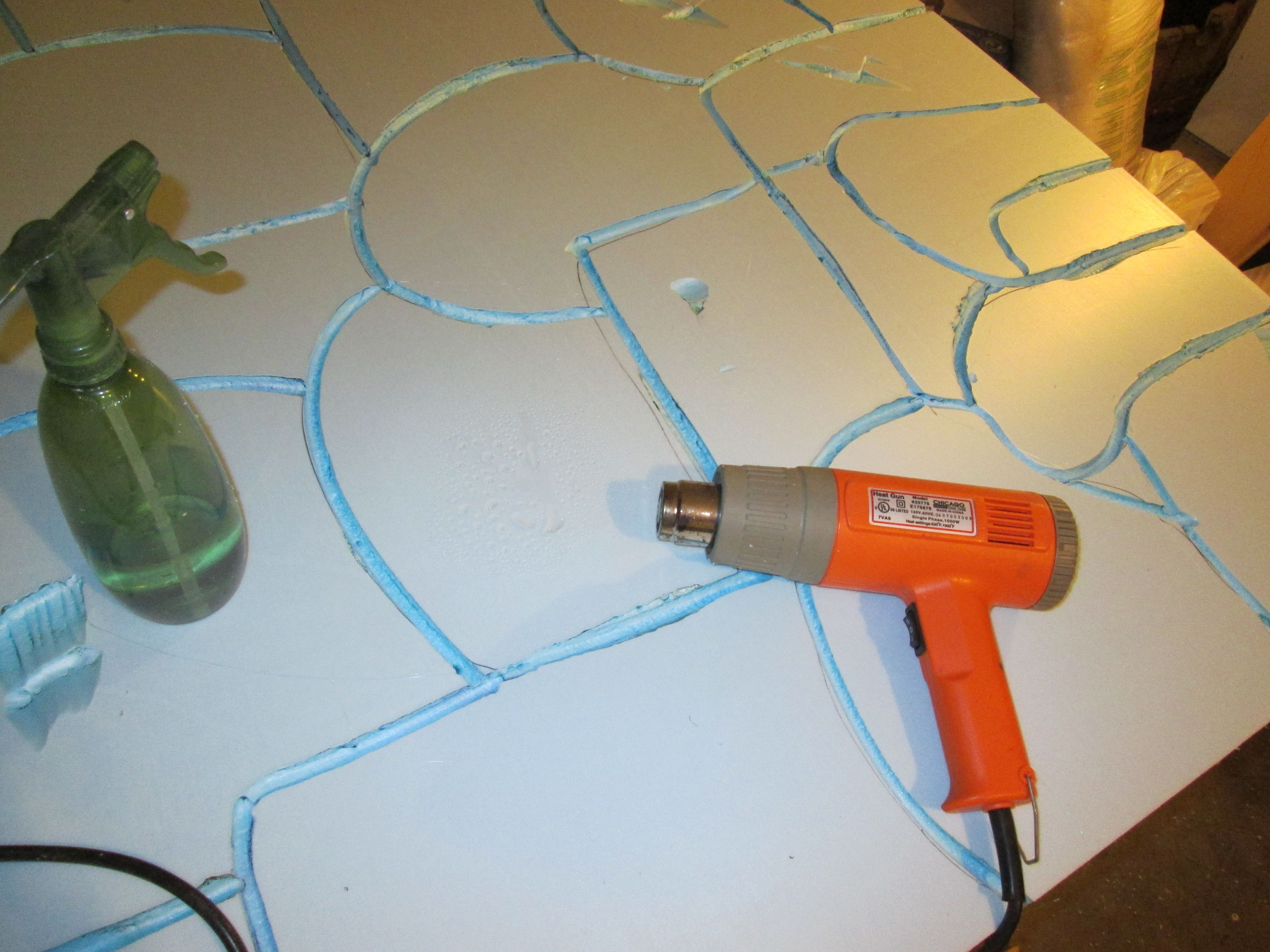 Next, you might want to rough up your foam so it’ll look more realistic. I ended up getting very carried away with this part! Too damned fun. On some of my stones I used a wire brush, and on all of them, I used a spray bottle and my heat gun.