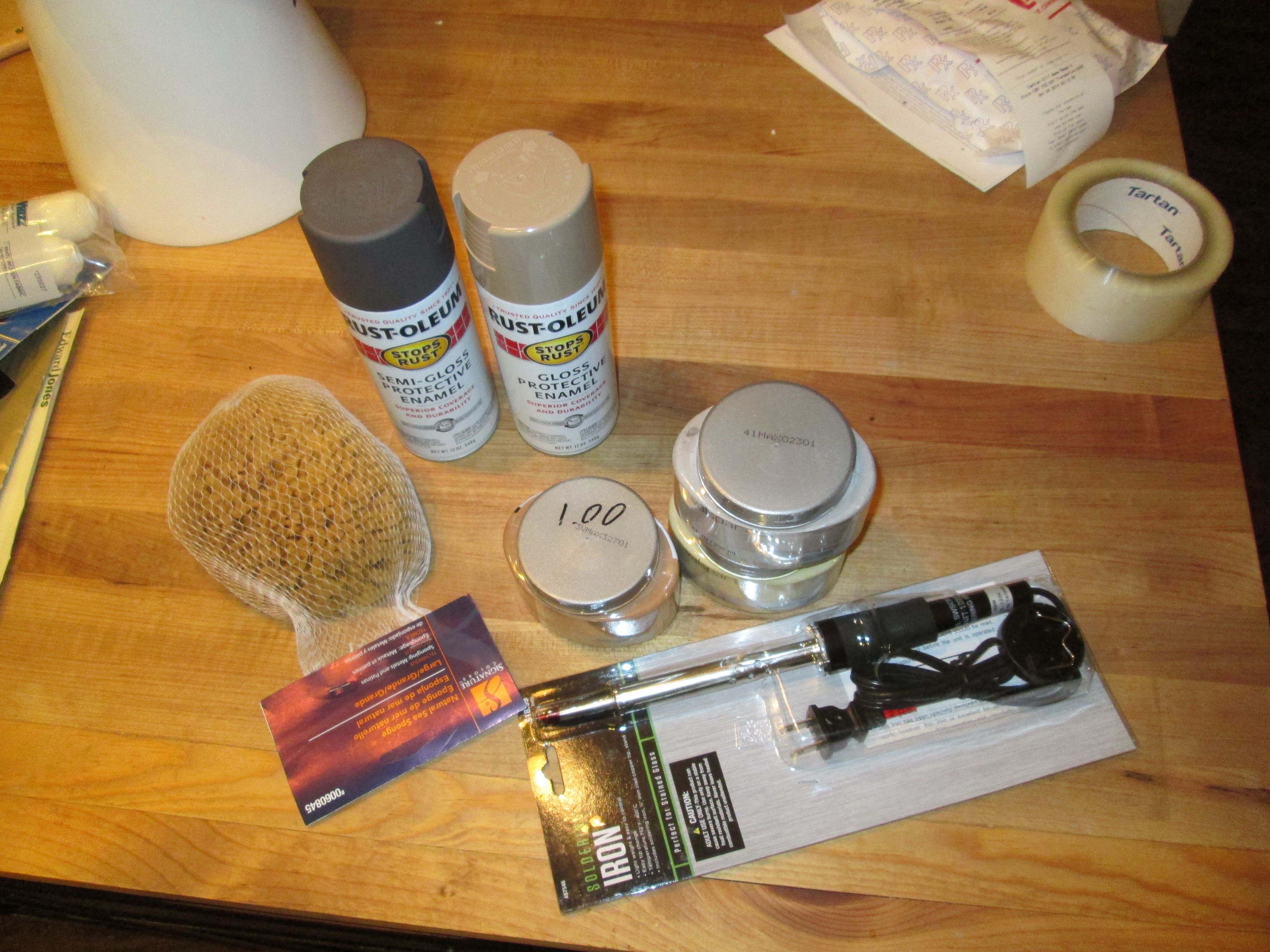 Spray paint the color I wanted my grout and stones to be, with additional colors that I could use to give it depth, a soudering iron, a heat gun (purchased at Home Depot for $10), a spray bottle and a sea sponge, although to be honest, I ended up not really using it. Anytime I needed to blend, I found it easier to use a wet cloth. No doubt, I had to add a bunch and actually not use some as the project progressed.