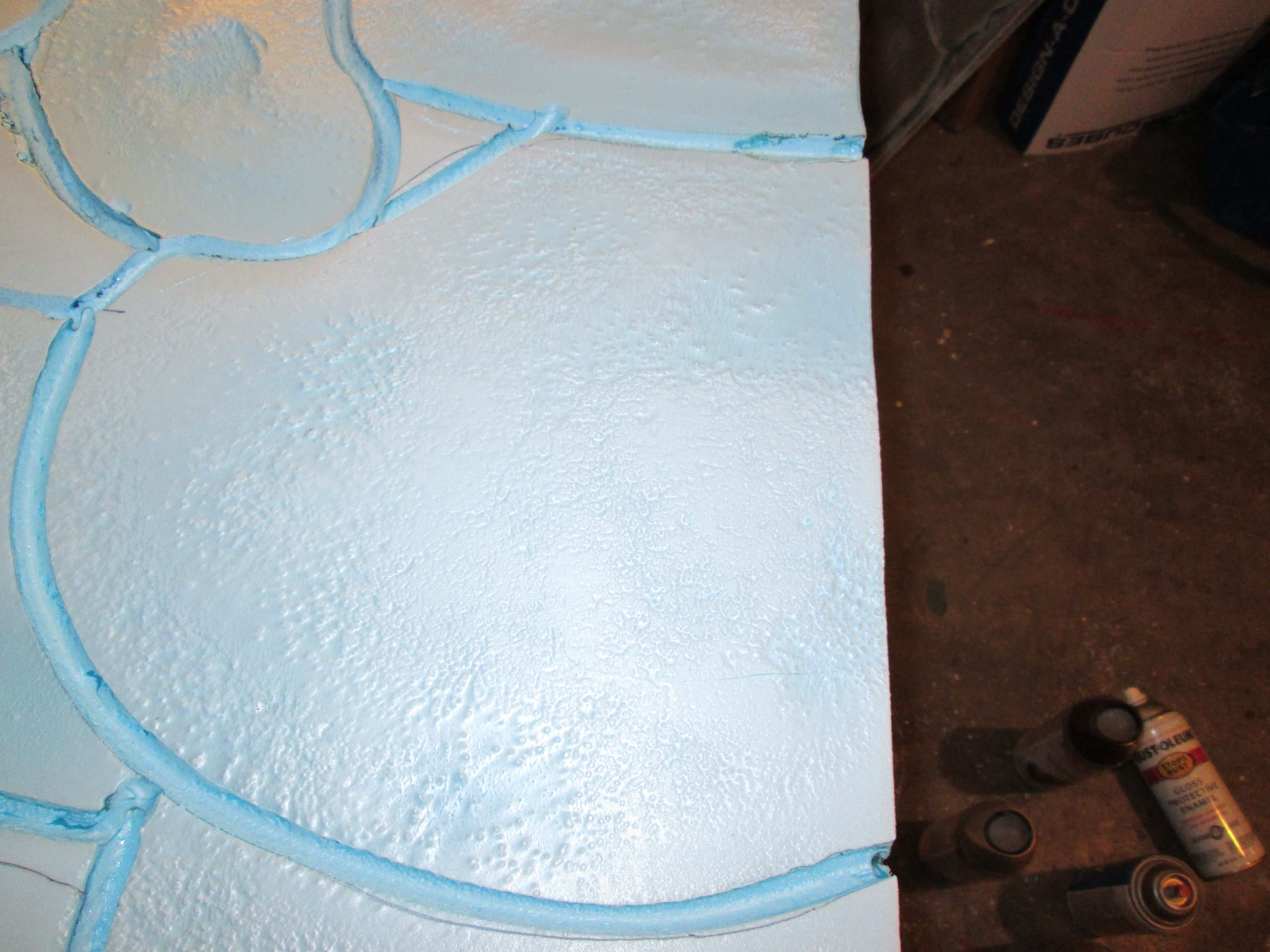 Now it’s time to play around with your colors. I wanted sand/brownish, so I used gray, brown, tan and almond to get the effect I wanted. The spray kindof does what the sponge would do. Spraying it about two feet away makes it mist and gave it highlights, giving the illusion of depth. Just start spraying your paint in layers. I also sprayed black in the deeper areas that I had distressed, and then highlighted the edges of those areas.