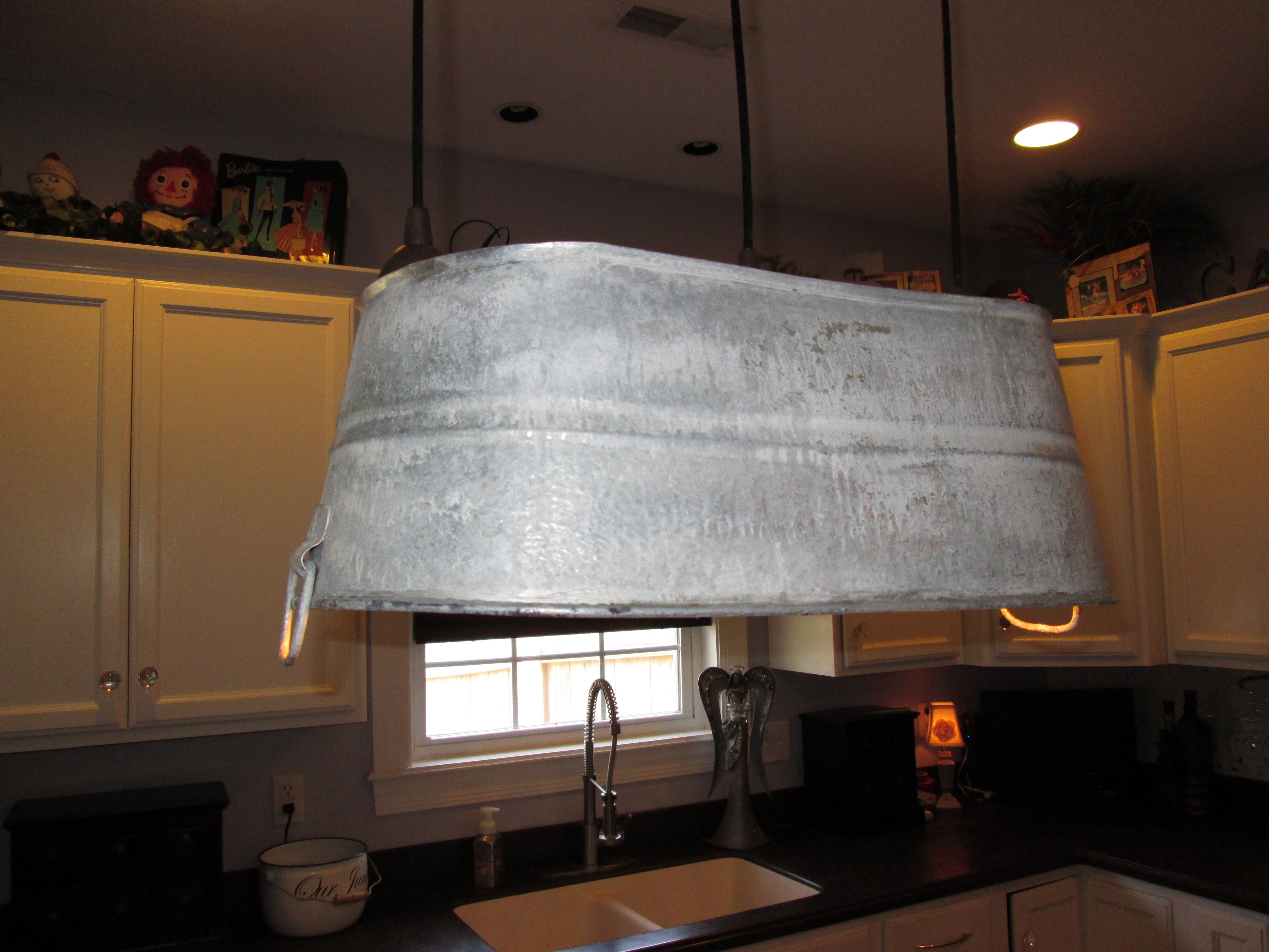 To mount the tub into the existing lights wasn’t difficult at all. Ideally, instead of three hanging lights, two probably would have been better, but I didn’t want to buy anything.